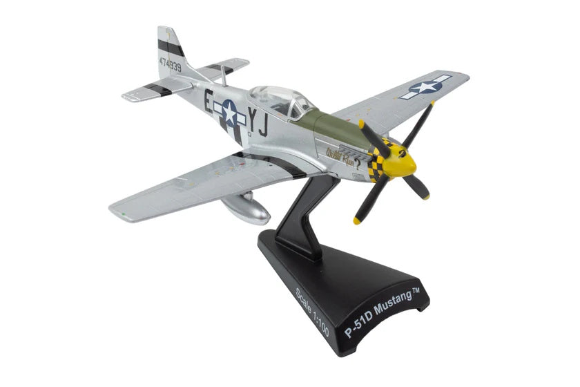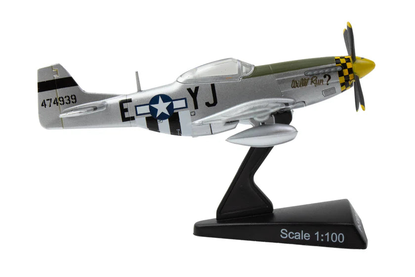 This die-cast metal airplane model of the P-51 "Willit Run" comes in 1:100 scale with plastic stand and is approximately 4 inches long with a 4 and 1/2 inch wingspan. It features the official Air Force insignia, the iconic checkerboard pattern on the nose near the propeller, and the "Willit Run" slogan written in cursive. For Adult Collectors ages 14+. Originally designed for the Royal Air Force, the P-51 became a long-range escort fighter for the U.S. armed forces against Nazi Germany. It was a high-altitude flyer able to stay in range with B-17 and B-24 bombers. Due to a quick and efficient production process, 14,000 were built. Among the more famous fighter pilots to fly a P-51 was Fred Le Febre. Flying missions out of Raydon, England, he flew two combat tours totaling 119 missions with the 351st Fighter Squadron of the 353rd Fighter Group. When he became Squadron Commander, the Fighter Group switched to the P-51 plane, and Lefebre's was named, "Willit Run."